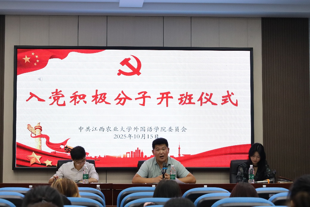 10月15日晚,外国语学院2025年下半年入党积极分子培训班开班仪式在院办322会议室举行。院学生党总支书记李文瑞、本科生第二党支部书记冷飞翔及本批次入党积极分子参加,会议由院党委正科级组织员张静主持。