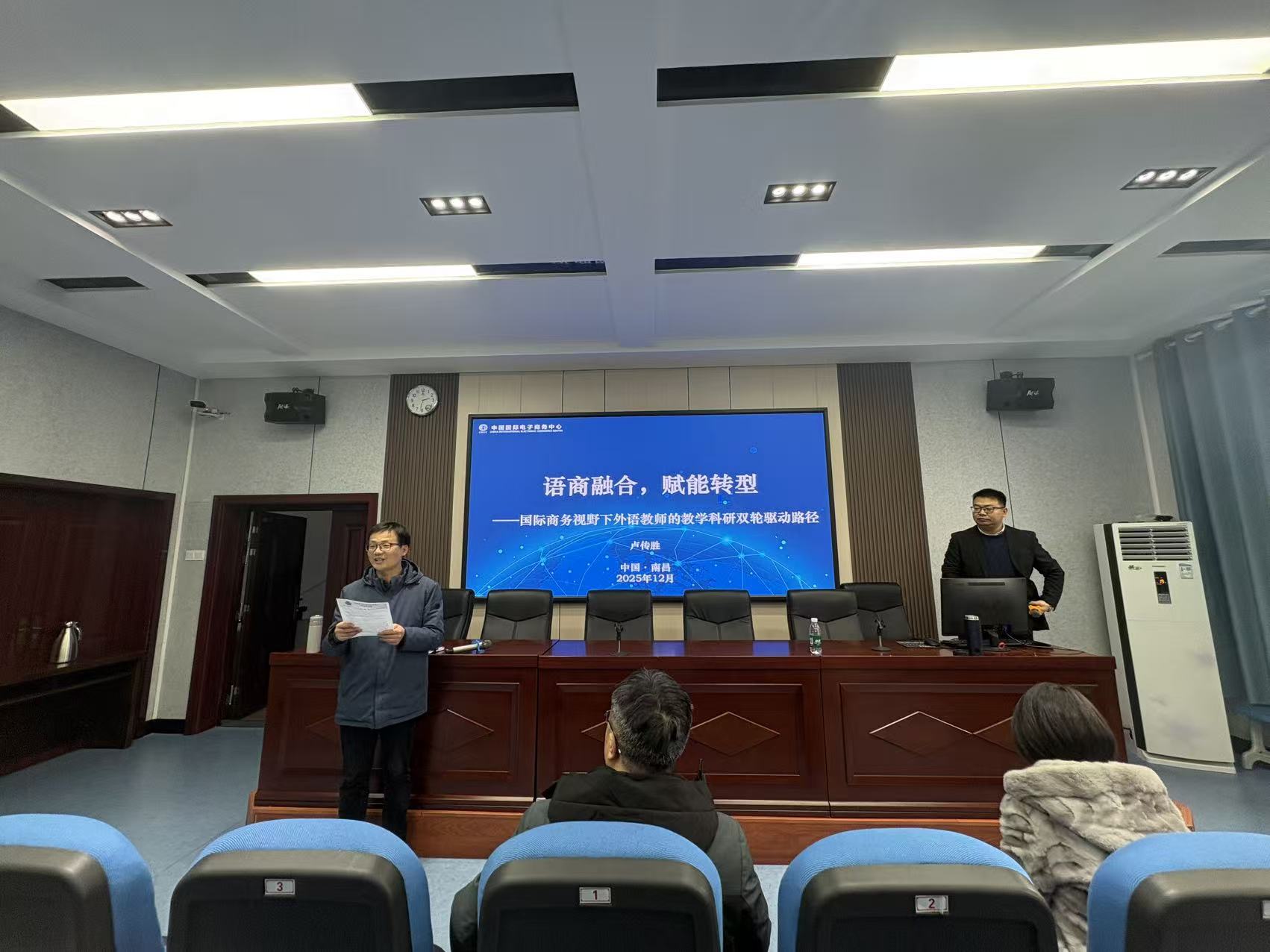 12月23日下午,深圳市跨境电子商务协会教育研究院院长、商务部中国国际电子商务中心特聘专家卢传胜应邀到我院,开展“语商融合,赋能转型——国际商务视野下外语教师的教学科研双轮驱动路径”学术讲座。讲座由学院陈泽源老师主持,外语专业20余名教师参会,共同探讨外语专业转型方向。